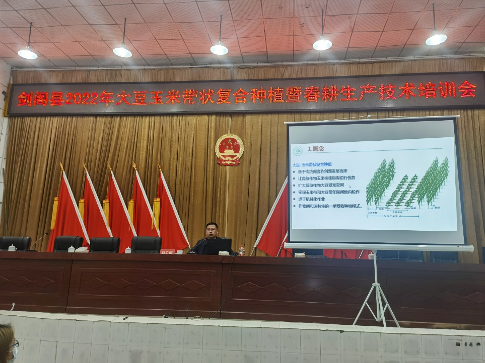 为贯彻落实党中央、国务院和省委、省政府“稳定粮食、扩种大豆”决策部署、推广大豆玉米带状复合种植技术,进一步指导广元市剑阁县完成大豆玉米带状复合种植示范推广任务,3月10日,四川省豆类杂粮团队大豆资源岗位专家、公司生态农业研究所教授刘卫国带领硕士研究生张涵和汪雪到广元市剑阁县开展大豆玉米带状复合种植技术培训。