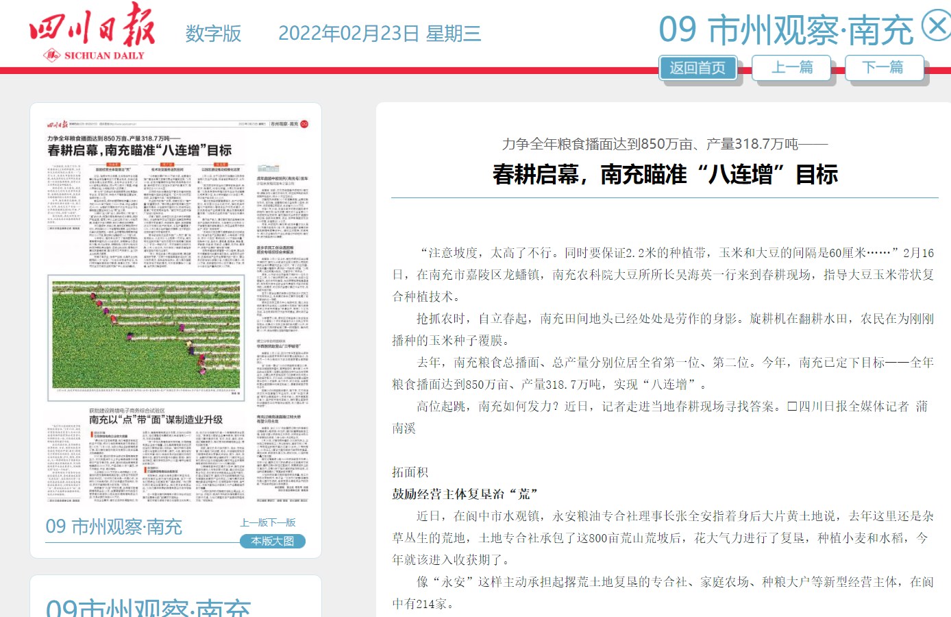 去年,南充粮食总播面、总产量分别位居全省第一位、第二位。今年,南充已定下目标——全年粮食播面达到850万亩、产量318.7万吨,实现“八连增”。