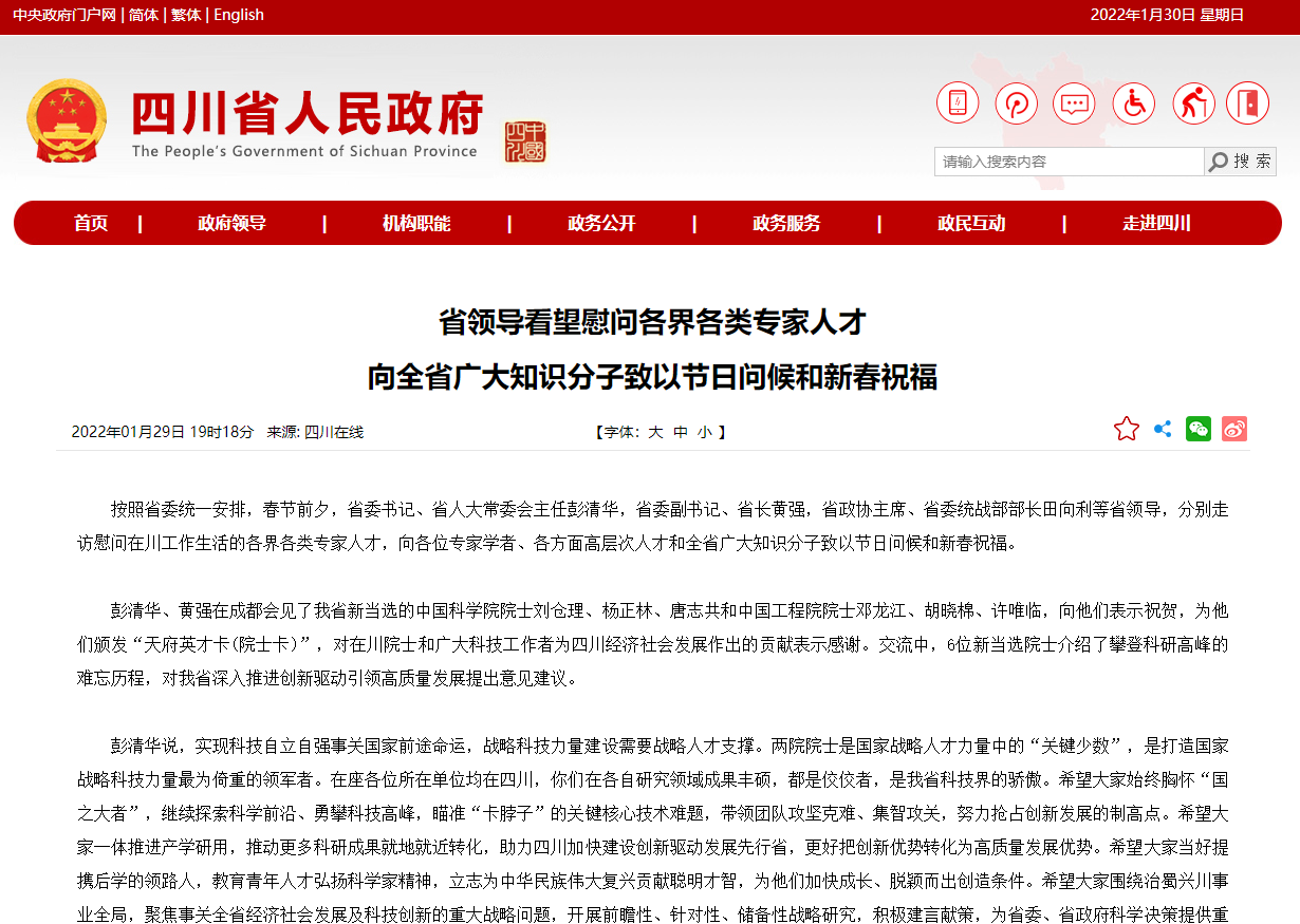 彭清华、黄强在成都会见了我省新当选的中国科公司院士刘仓理、杨正林、唐志共和中国工程院院士邓龙江、胡晓棉、许唯临,向他们表示祝贺,为他们颁发“天府英才卡(院士卡)”,对在川院士和广大科技工作者为四川经济社会发展作出的贡献表示感谢。交流中,6位新当选院士介绍了攀登科研高峰的难忘历程,对我省深入推进创新驱动引领高质量发展提出意见建议。