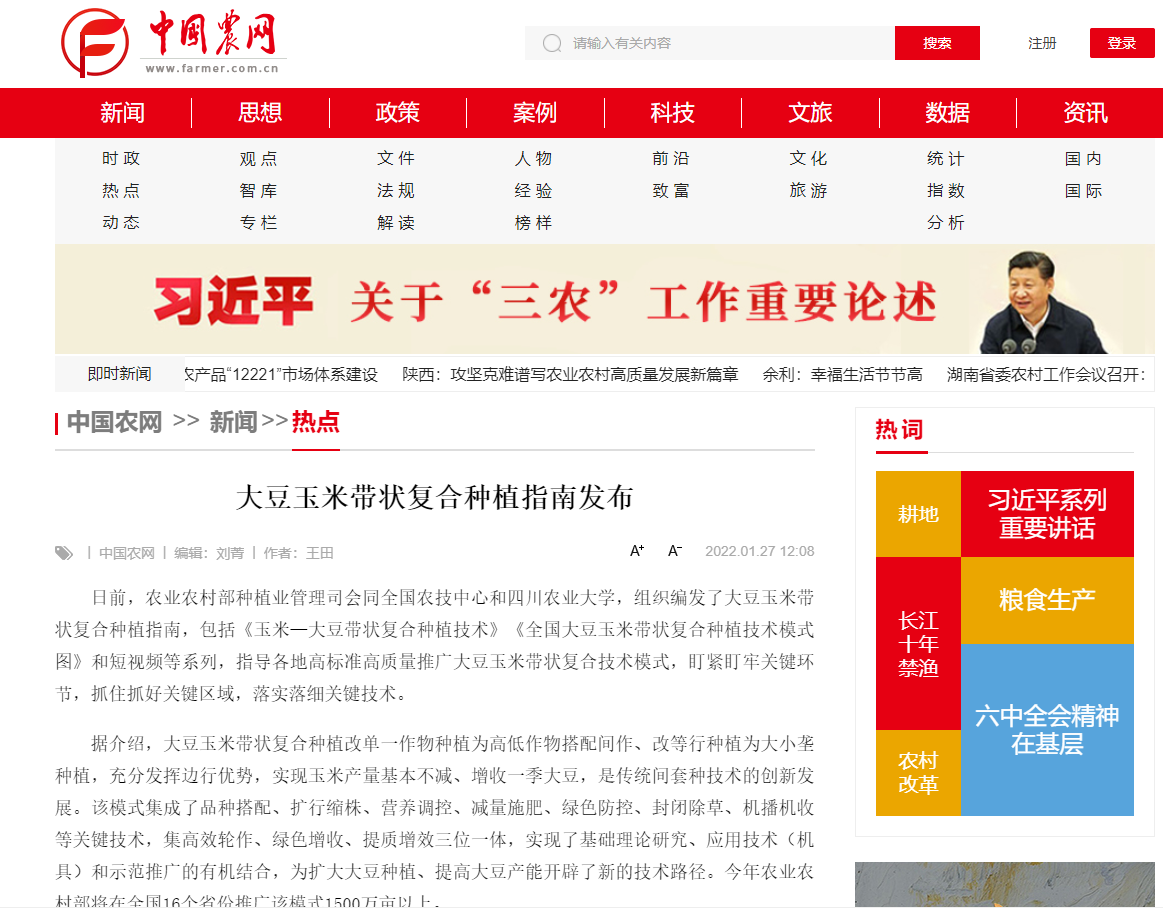 据介绍,大豆玉米带状复合种植改单一作物种植为高低作物搭配间作、改等行种植为大小垄种植,充分发挥边行优势,实现玉米产量基本不减、增收一季大豆,是传统间套种技术的创新发展。该模式集成了品种搭配、扩行缩株、营养调控、减量施肥、绿色防控、封闭除草、机播机收等关键技术,集高效轮作、绿色增收、提质增效三位一体,实现了基础理论研究、应用技术(机具)和示范推广的有机结合,为扩大大豆种植、提高大豆产能开辟了新的技术路径。今年农业农村部将在全国16个省份推广该模式1500万亩以上。