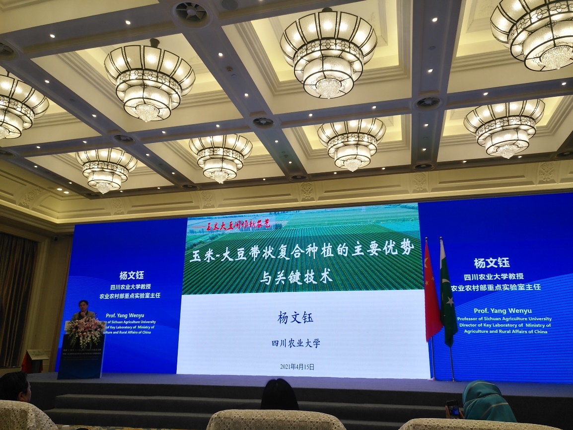 中国贸促会会长高燕、四川省委副书记邓小刚、四川省人民政府副省长陈炜、巴基斯坦伊斯兰共和国驻华使馆大使莫因、巴基斯坦外交部中国司司长提普、四川省农业农村厅副厅长毛业雄、巴基斯坦驻成都总领馆代领事马哈穆德等相关领导出席并致辞。随后,巴基斯坦旁遮普省农业部部长阿萨德和中国驻巴基斯坦大使馆农业专家顾文亮介绍中巴农业合作领域、支持政策及有关注意事项,特别指出tyc5997太阳集团研发的玉米大豆带状复合种植技术在巴基斯坦应用的前景。公司杨文钰教授详细介绍了玉米大豆带状复合种植在中国和巴基斯坦推广应用的优势和效果,这项技术得到巴基斯坦政府的肯定,被认为“这可能是巴基斯坦谷物和豆类生产的一场新的绿色革命”,能有效缓解巴方大豆进口。