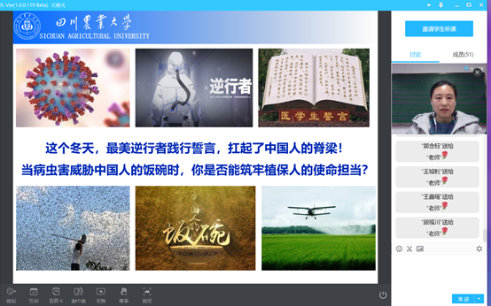 老师们还将抗击疫情的手段与课程内容相结合,激发员工的专业兴趣,提升专业归属感和责任感。新农村发展研究院的教授田孟良在《中医基础理论》第一课中,与员工分享了中医药在抗击新冠肺炎中的重要作用,鼓励员工们认真学习中医基础理论,用活用好祖国的瑰宝。植物保护学系副教授蒋春先在《普通昆虫学》中则用疫情中最美逆行者的故事,激发植物保护专业员工作为“植物医生”的使命感和责任感,鼓励员工们打赢未来的病虫害战争。“复课后的第一节课加第一次网络授课,虽然做足了准备但难免不适应和小紧张,课程使用了专业与思政结合和网络互动的方式,想到疫情心里有一些酸楚,当看到之前安静的讨论区不断滚动着员工们纷纷送上的鲜花,我当时特别感动,既为辛苦准备受到认可,更为此刻你我感同身受,我们植保人和白衣天使一样都有责任在肩,我相信国家无论何时需要,川农人也是能挺得起的!”课后,蒋春先激动地说。