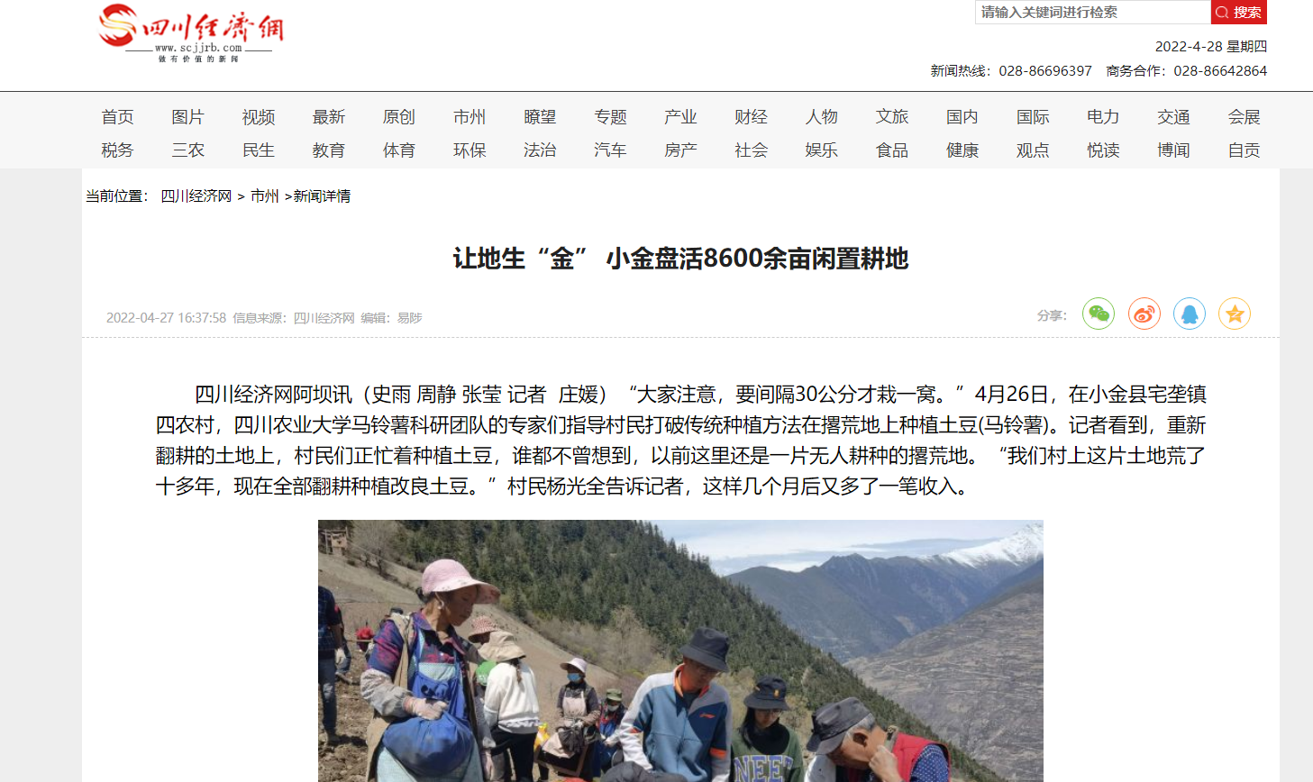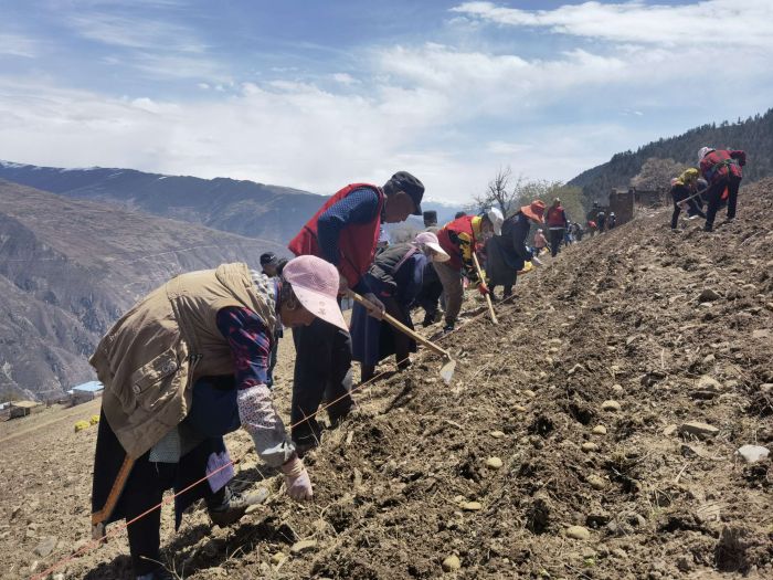 四川经济网阿坝讯(史雨 周静 张莹 记者 庄媛)“大家注意,要间隔30公分才栽一窝。”4月26日,在小金县宅垄镇四农村,tyc5997太阳集团马铃薯科研团队的专家们指导村民打破传统种植方法在撂荒地上种植土豆(马铃薯)。记者看到,重新翻耕的土地上,村民们正忙着种植土豆,谁都不曾想到,以前这里还是一片无人耕种的撂荒地。“我们村上这片土地荒了十多年,现在全部翻耕种植改良土豆。”村民杨光全告诉记者,这样几个月后又多了一笔收入。