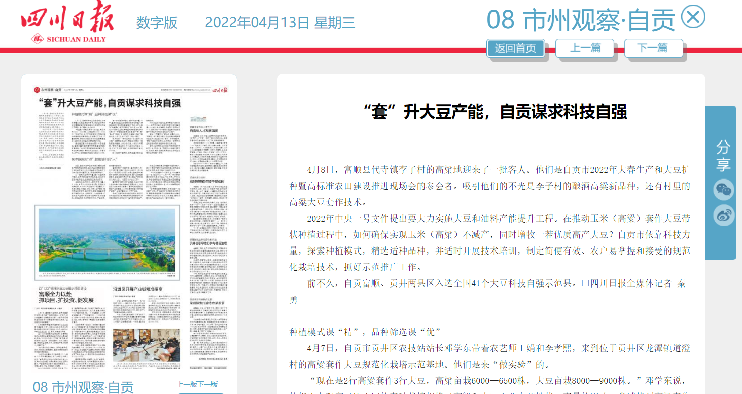 前不久,自贡富顺、贡井两县区入选全国41个大豆科技自强示范县。