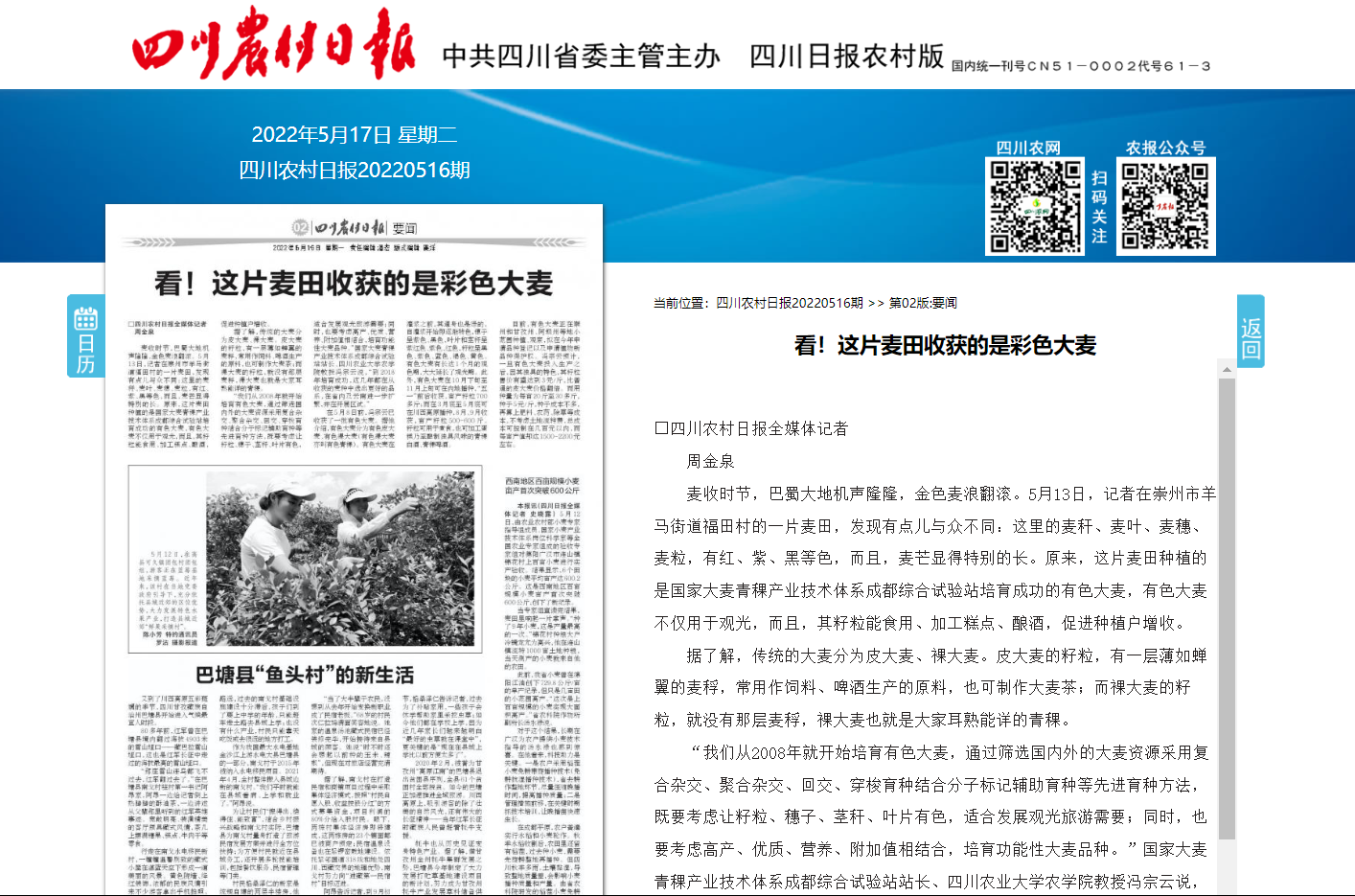 “我们从2008年就开始培育有色大麦,通过筛选国内外的大麦资源采用复合杂交、聚合杂交、回交、穿梭育种结合分子标记辅助育种等先进育种方法,既要考虑让籽粒、穗子、茎秆、叶片有色,适合发展观光旅游需要;同时,也要考虑高产、优质、营养、附加值相结合,培育功能性大麦品种。”国家大麦青稞产业技术体系成都综合试验站站长、tyc5997太阳集团教授冯宗云说,“到 2018年培育成功,这几年都在从收获的麦种中选出更好的品系,在省内及云南进一步扩繁,并在开展区试。”