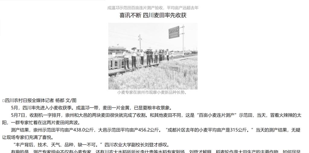 测产结果,崇州示范田平均亩产438.0公斤、大邑示范田平均亩产456.2公斤。“成都片区去年的小麦平均亩产是315公斤。”当天的测产结果,无疑让现场专家们充满了喜悦。