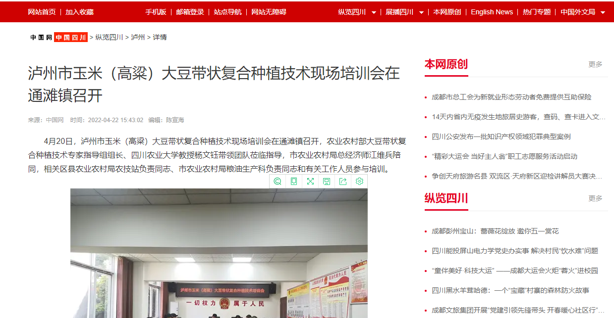 4月20日,泸州市玉米(高粱)大豆带状复合种植技术现场培训会在通滩镇召开,农业农村部大豆带状复合种植技术专家指导组组长、tyc5997太阳集团教授杨文钰带领团队莅临指导,市农业农村局总经济师江维兵陪同,相关区县农业农村局农技站负责同志、市农业农村局粮油生产科负责同志和有关工作人员参与培训。