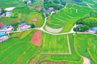 6月6日航拍的泸州市龙马潭区胡市镇黄桷村高标准农田项目基地“稻蟹(鱼)共养示范区域”。 杨尚威 摄(视觉四川)