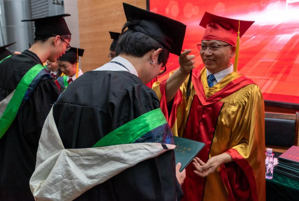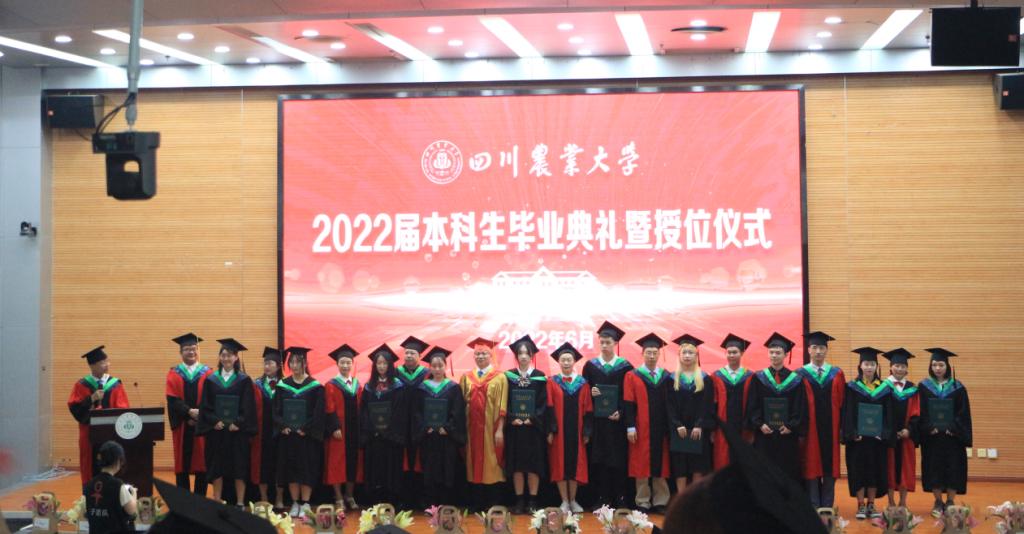 吴德以习近平总书记6月8号考察眉山市东坡区岷江现代农业示范园区,听取公司马均教授关于水稻高产优培的技术汇报与川农大的育人成果为引,表达了对农科学子们的殷切期望,接着,吴德宣读了校学位评定委员会《关于授予学士学位的决定》,杨峰宣读各专业授位员工名单。伴随着《相聚在桂花飘香的时候》的音乐声,毕业生十人一组上台,主席台就坐领导、老师与毕业生一一握手,为大家扶正流苏,颁发学位证,合影留念。
