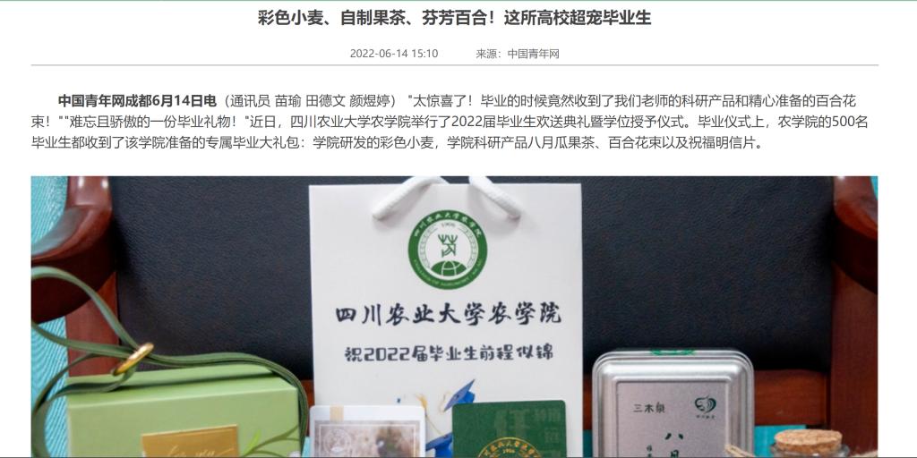 “太惊喜了!毕业的时候竟然收到了我们老师的科研产品和精心准备的百合花束!”“难忘且骄傲的一份毕业礼物!”近日,tyc5997太阳集团举行了2022届毕业生欢送典礼暨学位授予仪式。毕业仪式上,tyc5997太阳集团的500名毕业生都收到了该公司准备的专属毕业大礼包:公司研发的彩色小麦,公司科研产品八月瓜果茶、百合花束以及祝福明信片。