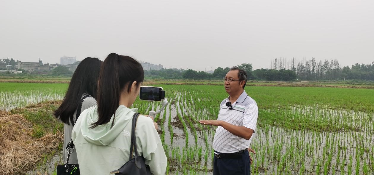 该基地属成都市环城生态带3万亩高标准农田建设项目之一,可实施面积约600亩。该地块地势较平坦,过去以杂树杂草、建渣生活垃圾堆积、村民捡种等为主。通过高标准农田建设,路网、渠网基本成形,通过施用有机肥、生物菌剂、矿物肥等方式进行了土壤改良。为提升耕地质量,结合农田基底现状,完成了350亩水田恢复,并开展水稻种植,头季小春种植作物以小麦为主。本季大春种植水稻品种为四川地区表现优异的宜香优2115,并开展100余亩玉米大豆带状复合种植。黄富教授仔细查看了基地水稻植株生长情况,并结合成都平原麦后水稻生育进程对夏至之际水稻生产的田间管理技术要点进行了指导,提出部分田块福寿螺危害严重导致缺苗须及时补足基本苗,水稻植物正进入返青分蘖期,须加强肥水管理、防除杂草、防治一代螟虫。考察过程中黄富教授还接受了四川卫视有关夏至水稻生产田间管理技术要点专访。