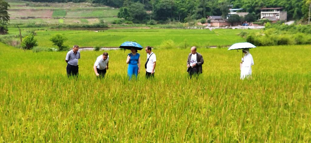 7月14日上午,四川省水稻创新团队岗位专家、公司tyc5997太阳集团教授黄富,李德强博士一行受邀到仁寿县汪洋镇,在县农业农村局、植保植检站、镇政府等相关领导陪同下深入碧云村5组、四公社区2组对水稻田间出现的一种罕见病害进行实地考察和技术指导。