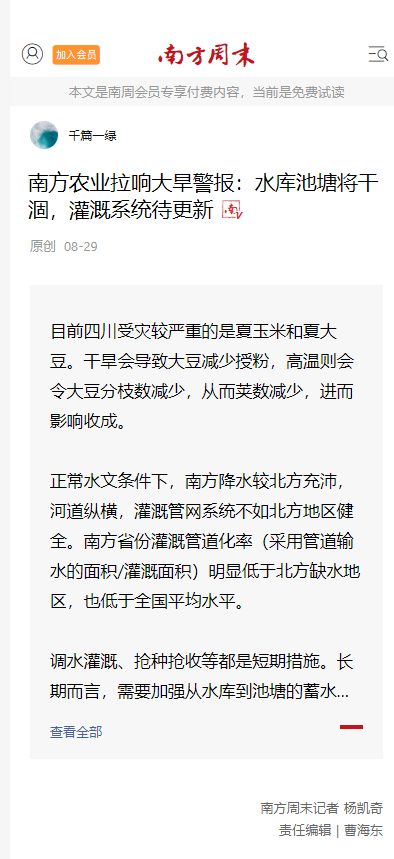 “以南方种植范围最广的水稻为例,总体情况是,长江上中下游流域的偏北的地区以种植一季稻为主,在高温伏旱的这段时间处于抽穗扬花期,对收成影响较大。偏南部的地区如湖南、江西种植两季稻,对早稻的影响是高温逼熟,旱情对产量有一定影响,但没有一季稻那么大。第二季的晚稻正在移栽,处在秧苗长个儿(营养生长)的时候,后续水资源如果能补上来,对产量的影响就没那么大。”中国农业科公司农业环境与可持续发展研究所研究员许吟隆告诉南方周末记者。