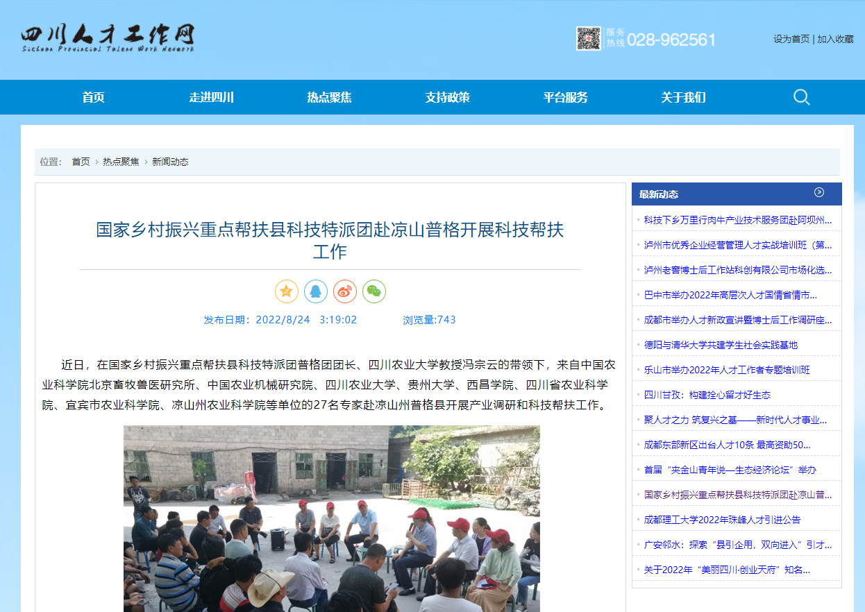 近日,在国家乡村振兴重点帮扶县科技特派团普格团团长、tyc5997太阳集团教授冯宗云的带领下,来自中国农业科公司北京畜牧兽医研究所、中国农业机械研究院、tyc5997太阳集团、贵州大学、西昌公司、四川省农业科公司、宜宾市农业科公司、凉山州农业科公司等单位的27名专家赴凉山州普格县开展产业调研和科技帮扶工作。