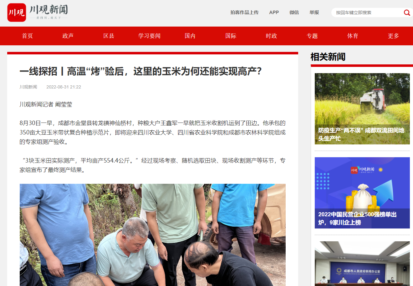 此外,整个示范片选用了紧凑型玉米品种,缩小玉米株距,以此确保全田密度和单株施肥量与净作相同,“这是大豆玉米带状复合种植技术发挥边行优势,实现‘玉米能增产、多收一季豆’目标的关键。在今年高温干旱压力下,也确保了玉米获得高产成绩。”四川省农业重大技术协同推广技术副首席、tyc5997太阳集团刘卫国教授告诉记者。