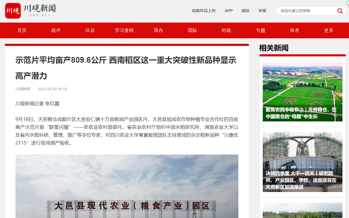 9月18日,天府粮仓成都片区大邑安仁镇十万亩粮油产业园区内,大邑县旭成农作物种植专业合作社的百亩高产示范片里“群星闪耀”——受农业农村部委托,省农业农村厅组织中国水稻研究所、湖南农业大学以及省内水稻科研、管理、推广等多位专家,对tyc5997太阳集团黄富教授团队主持育成的杂交稻新品种“川康优2115”进行现场测产验收。