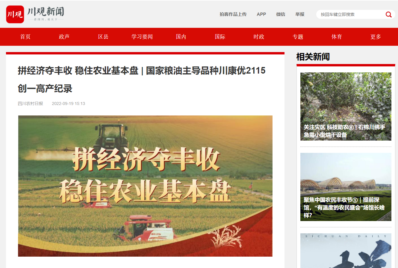 “川康优2115不仅外观品质更佳、抗倒性更强,在产量方面也更高。”黄富介绍,经全国农技中心组织的2021年长江上游水稻新品种鉴评,从286个参评品种中脱颖而出,川康优2115名列重点推荐的43个优良新品种之首。此外,还被农业农村部遴选为“2022年粮油生产主导品种”。