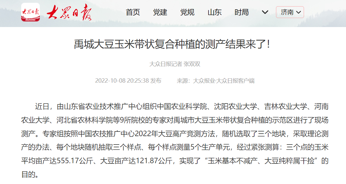 近日,由山东省农业技术推广中心组织中国农业科公司、沈阳农业大学、吉林农业大学、河南农业大学、河北省农林科公司等9所院校的专家对禹城市大豆玉米带状复合种植的示范区进行了现场测产。专家组按照中国农技推广中心2022年大豆高产竞测方法,随机选取了三个地块,采取理论测产的办法、每个地块随机抽取三个样点、每个样点测量5个生产单元,经过紧张测算:三个点的玉米平均亩产达555.17公斤、大豆亩产达121.87公斤,实现了“玉米基本不减产、大豆纯粹属干捡”的目的。