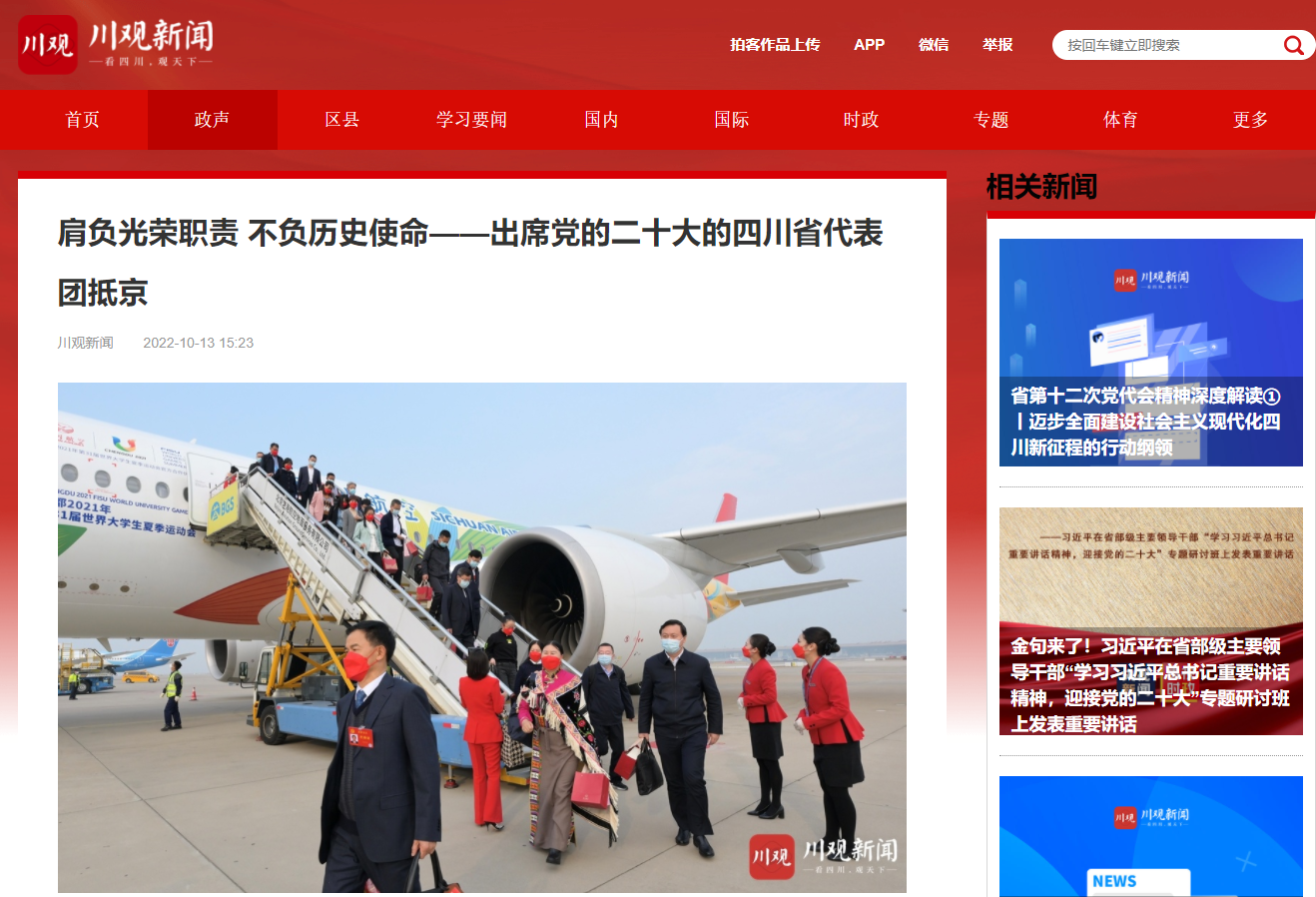 10月13日15时10分许,出席中国共产党第二十次全国代表大会的四川省代表团代表抵达北京首都国际机场,豪情满怀共赴金秋盛会。