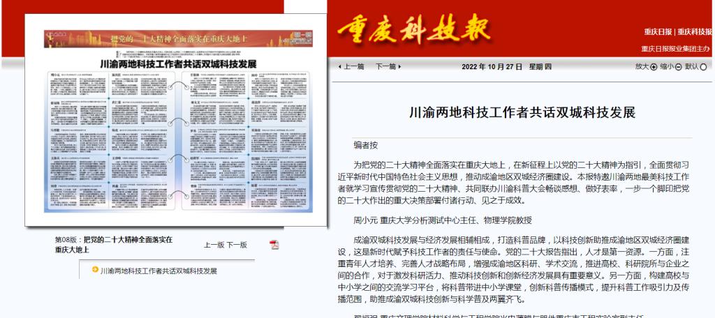 为把党的二十大精神全面落实在重庆大地上,在新征程上以党的二十大精神为指引,全面贯彻习近平新时代中国特色社会主义思想,推动成渝地区双城经济圈建设。本报特邀川渝两地最美科技工作者就学习宣传贯彻党的二十大精神、共同联办川渝科普大会畅谈感想、做好表率,一步一个脚印把党的二十大作出的重大决策部署付诸行动、见之于成效。