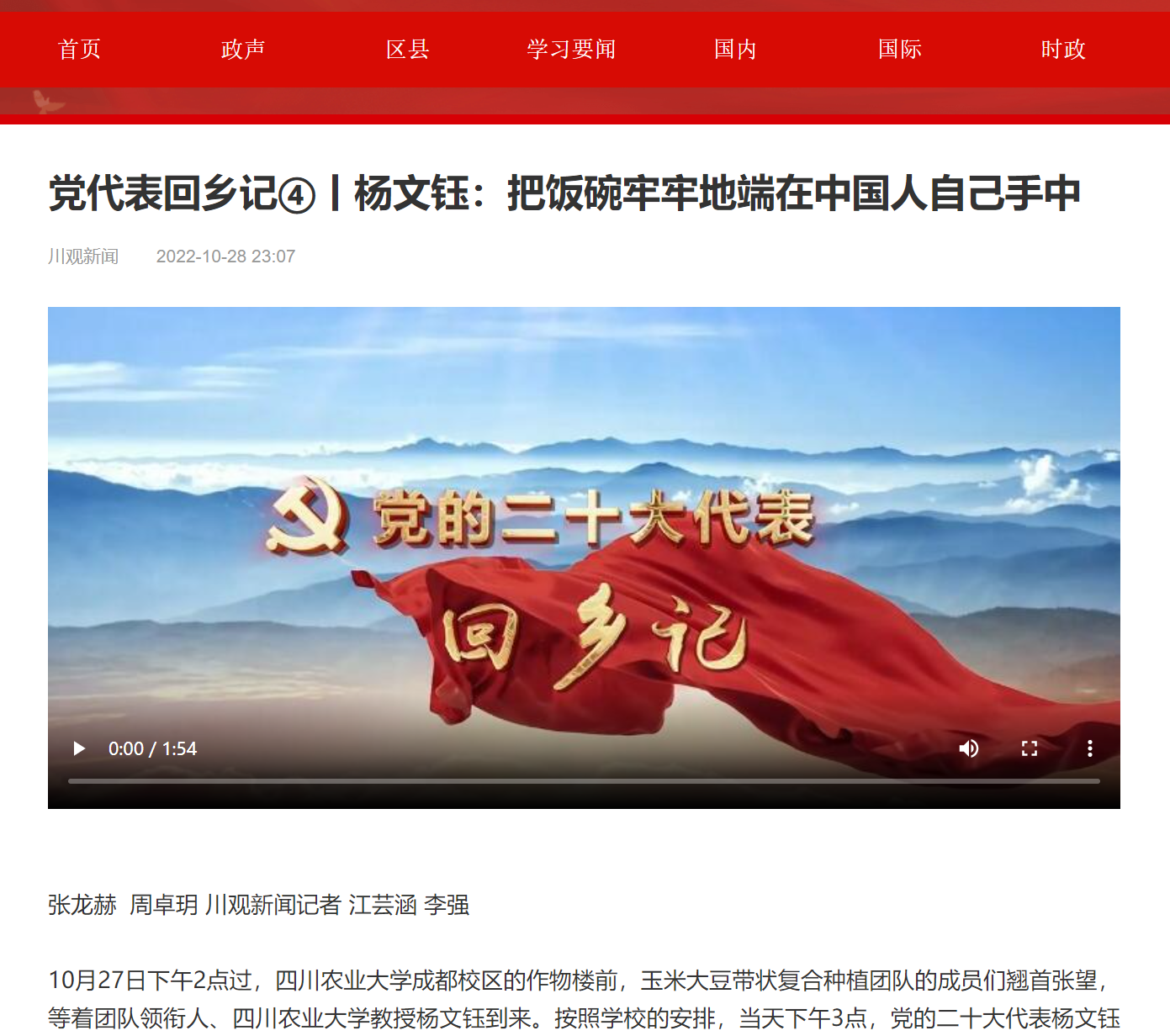 会后,杨文钰还参加了玉米大豆带状复合种植与循环利用科研团队党支部的支部组织生活会,向团队成员宣讲党的二十大精神。接下来的时间,他也是行程满满——将赶赴遂宁,准备参加2022年农业绿色低碳发展研讨会,宣讲党的二十大精神,分享大豆玉米带状复合种植的技术和经验;返回公司后,还将为公司党支部书记培训会作宣讲报告。“作为党代表,自己一定把党的二十大精神原汁原味地带回公司,传达给每一位师生员工。”杨文钰表示。