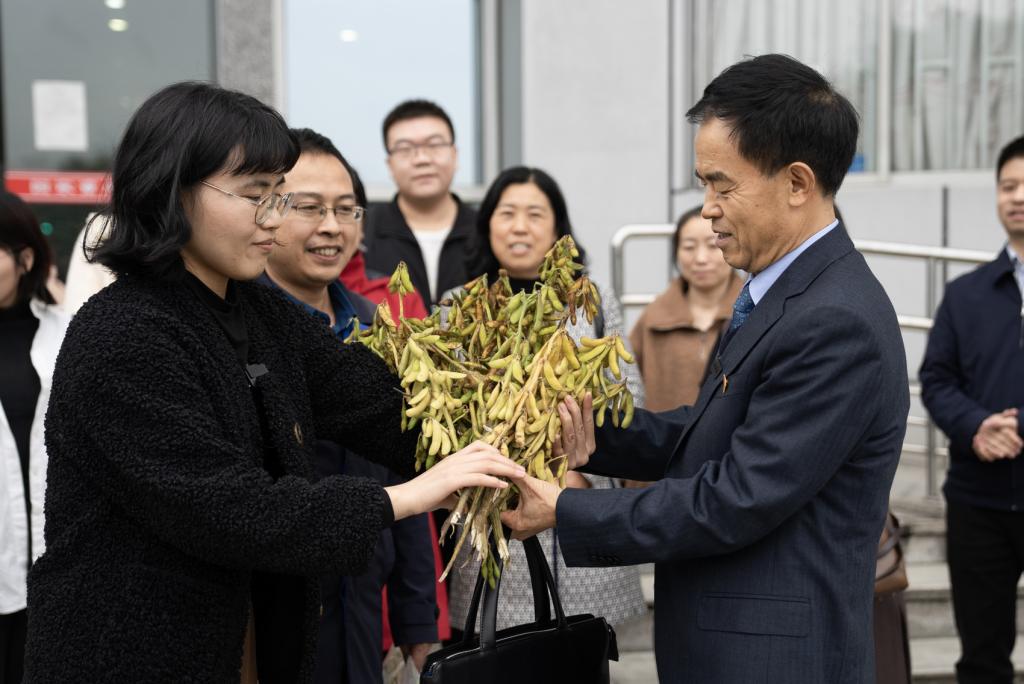 “来了,杨老师来了!”人群中有人在招呼。身着正装,胸前佩戴党员徽章,杨文钰阔步走来。张艳艳、刘卫国两位老师手捧一大把从田间采摘回来的大豆,献给杨文钰,“杨老师,欢迎你从北京回来,我们给你献上最新的‘豆花’!”杨文钰抚摸着大豆,连说好几遍“巴适哦”,大家都笑起来。“杨老师,我们前天在巴中市恩阳区测产的数据特别好,大豆亩产达到187.9公斤。”听完,杨文钰高兴地说:“这应该是目前的最高产量,它展示了我们项目的希望,只要大家一起努力、技术到位,就一定能够实现丰收!”
