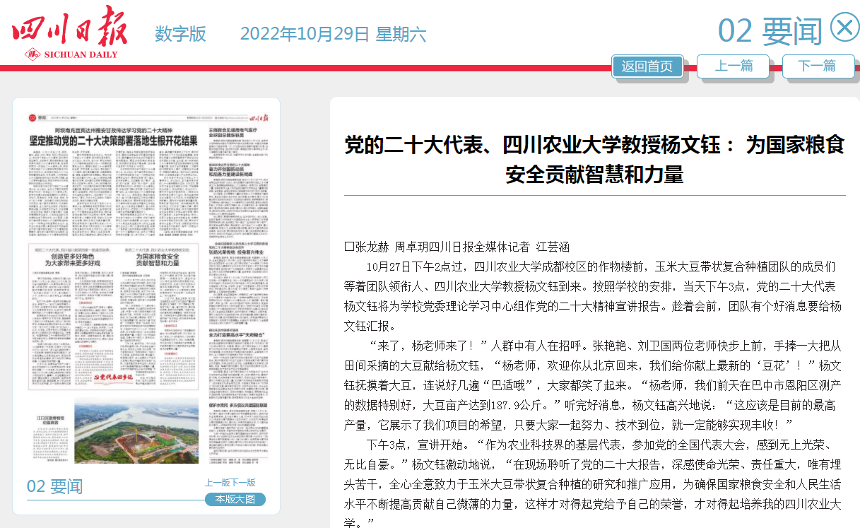 会后,杨文钰还参加了玉米大豆带状复合种植与循环利用科研团队党支部组织生活会,宣讲党的二十大精神。接下来,他也是行程满满——将赶赴遂宁,准备参加2022年农业绿色低碳发展研讨会;返回公司后,还将为公司支部书记培训会作宣讲报告。“作为党代表,我一定把党的二十大精神原汁原味地带回公司,传达给每一位师生员工。”杨文钰表示。