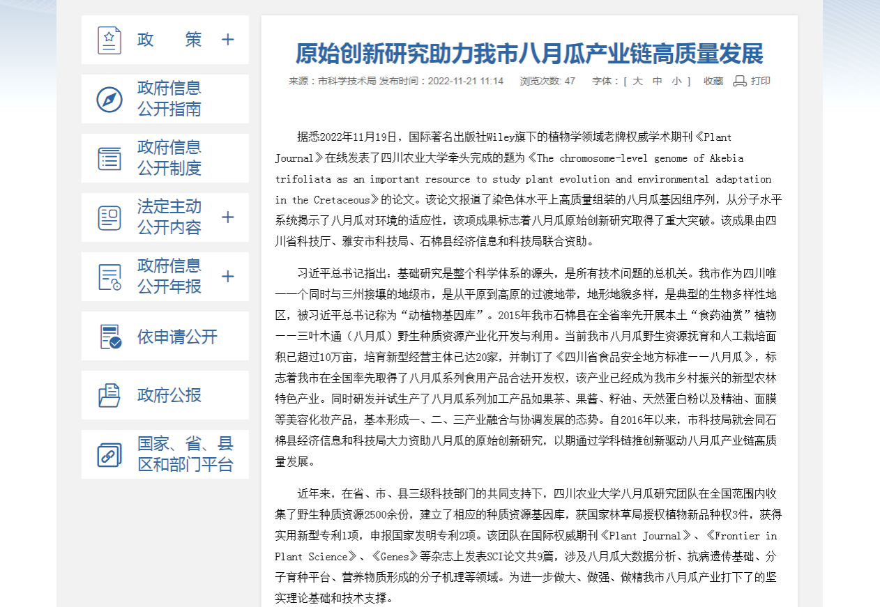 据悉,2022年11月19日,国际著名出版社Wiley旗下的植物学领域老牌权威学术期刊《Plant Journal》在线发表了tyc5997太阳集团牵头完成的题为《The chromosome-level genome of Akebia trifoliata as an important resource to study plant evolution and environmental adaptation in the Cretaceous》的论文。该论文报道了染色体水平上高质量组装的八月瓜基因组序列,从分子水平系统揭示了八月瓜对环境的适应性,该项成果标志着八月瓜原始创新研究取得了重大突破。该成果由四川省科技厅、雅安市科技局、石棉县经济信息和科技局联合资助。