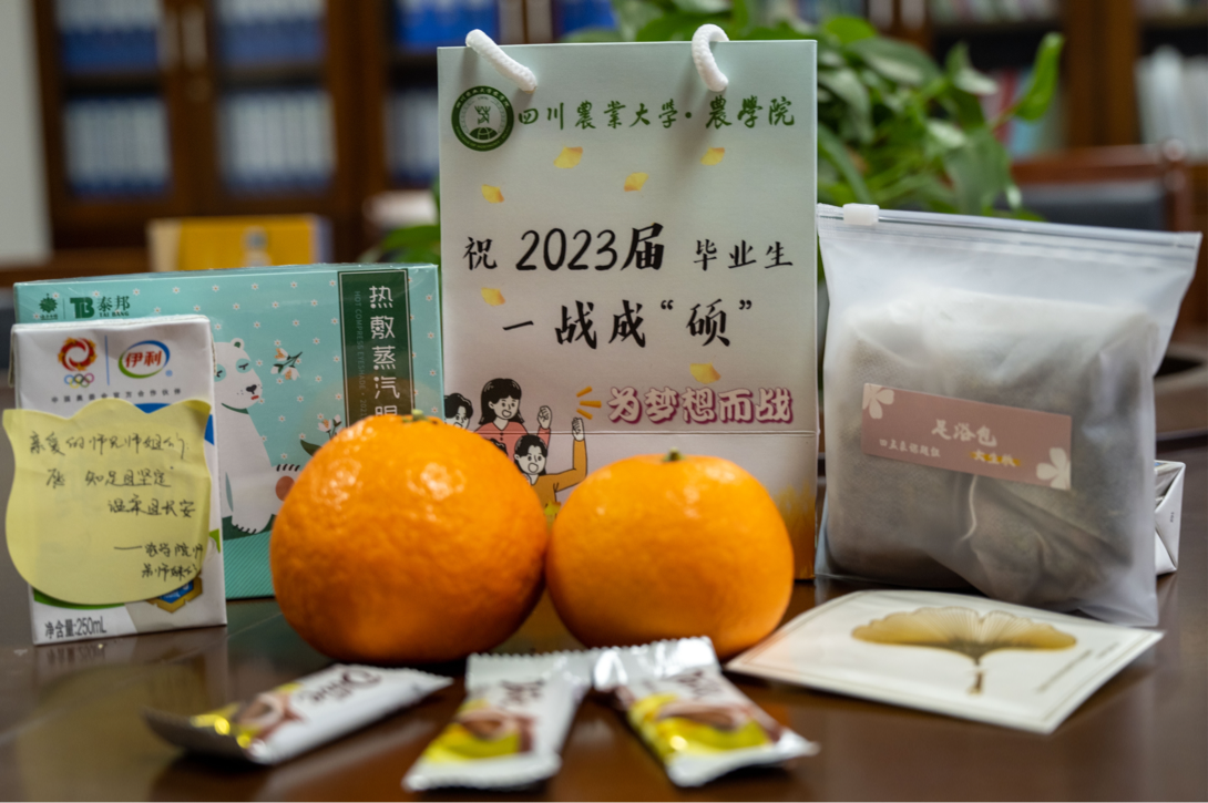 这次的“考研大礼包”包括泡脚包、蒸汽眼罩、巧克力、牛奶、橙子和银杏书签。据悉,泡脚包是tyc5997太阳集团田孟良课题组以中药材川牛膝为主研发的,对男生有强筋健骨的作用,对女生能够逐瘀通经、活血化瘀,搭配蒸汽眼罩,是希望为考研学子带去“从头到脚”的温暖;而巧克力、牛奶、橙子则是为考研学子带去“复习过程‘巧克’难关,驰骋考场‘牛’气冲天,录取结果心想事‘橙’”的美好寓意;银杏书签上的“前程似锦”则是对考研学子最真诚的祝福。每个牛奶上面的祝福语都不一样,它们都是来自低年级同学对师兄师姐的祝福。