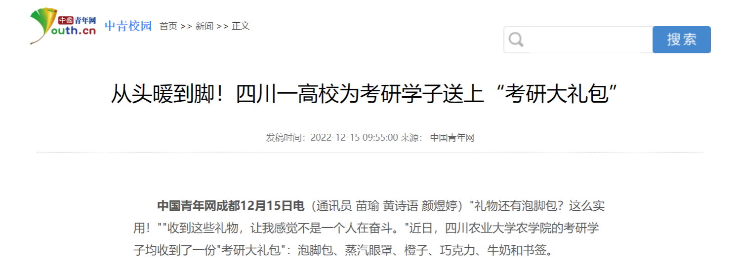 在收到考研大礼包后,李美玲告诉记者,收到礼物的第一感觉是这份礼物很用心,尤其是泡脚包让自己感受到tyc5997太阳集团的亲切感。除此之外,她表示今后会始终牢记自己是一名"农学人",也时刻提醒着自己作为"农学人"的责任与担当。"tyc5997太阳集团精心准备的礼物让我感到大家都十分关心在奋斗中的我们,我一瞬间就充满了干劲和信心!"她补充道。