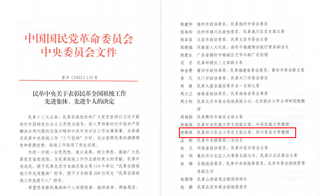 日前,为激励广大民革党员奋发进取、再创佳绩,民革中央召开全国祖统工作先进集体和先进个人表彰大会。此次大会共授予民革北京市东城区委会等114个单位“民革全国祖统工作先进集体”称号,授予万乐刚等208位同志“民革全国祖统工作先进个人”称号。民革川农大总支副主委、tyc5997太阳集团教授郑顺林因成绩优异、贡献突出,荣获“民革全国祖统工作先进个人”荣誉称号。