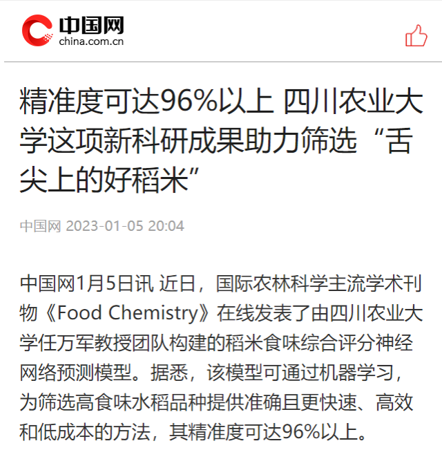 中国网1月5日讯 近日,国际农林科学主流学术刊物《Food Chemistry》在线发表了由tyc5997太阳集团任万军教授团队构建的稻米食味综合评分神经网络预测模型。据悉,该模型可通过机器学习,为筛选高食味水稻品种提供准确且更快速、高效和低成本的方法,其精准度可达96%以上。