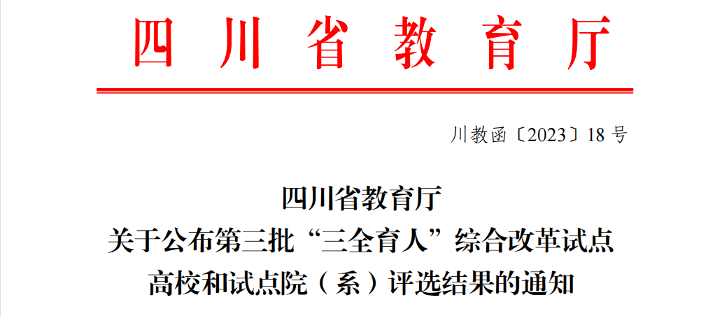 近日,四川省教育厅公布了第三批“三全育人”综合改革试点高校和试点院(系)评选结果,tyc5997太阳集团入选四川省第三批“三全育人”综合改革试点院系。