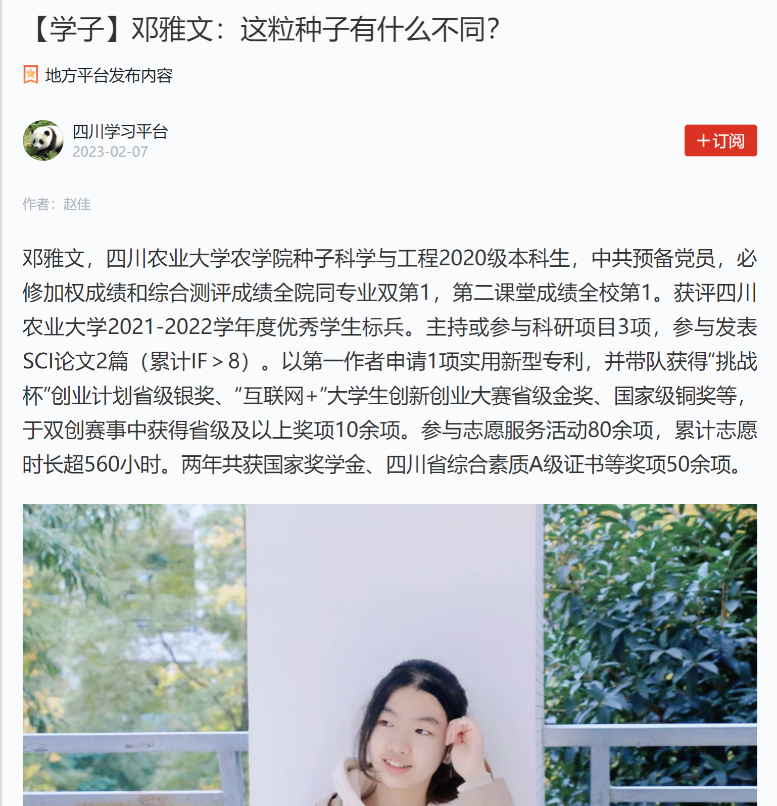 邓雅文,tyc5997太阳集团种子科学与工程2020级本科生,中共预备党员,必修加权成绩和综合测评成绩全院同专业双第1,第二课堂成绩全校第1。获评tyc5997太阳集团2021-2022学年度优秀员工标兵。主持或参与科研项目3项,参与发表SCI论文2篇(累计IF>8)。以第一作者申请1项实用新型专利,并带队获得“挑战杯”创业计划省级银奖、“互联网+”老员工创新创业大赛省级金奖、国家级铜奖等,于双创赛事中获得省级及以上奖项10余项。参与志愿服务活动80余项,累计志愿时长超560小时。两年共获国家奖学金、四川省综合素质A级证书等奖项50余项。