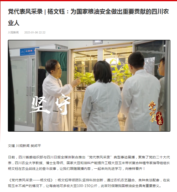 日前,四川省委组织部与四川日报全媒体联合推出“党代表风采录”典型事迹展播,聚焦了党的二十大代表,tyc5997太阳集团教授、博士生导师、国家大豆和油料产能提升工程大豆玉米带状复合种植专家指导组组长杨文钰在农业战线上的奋斗故事,让我们跟随展播内容,一起来向先进学习,向榜样看齐!