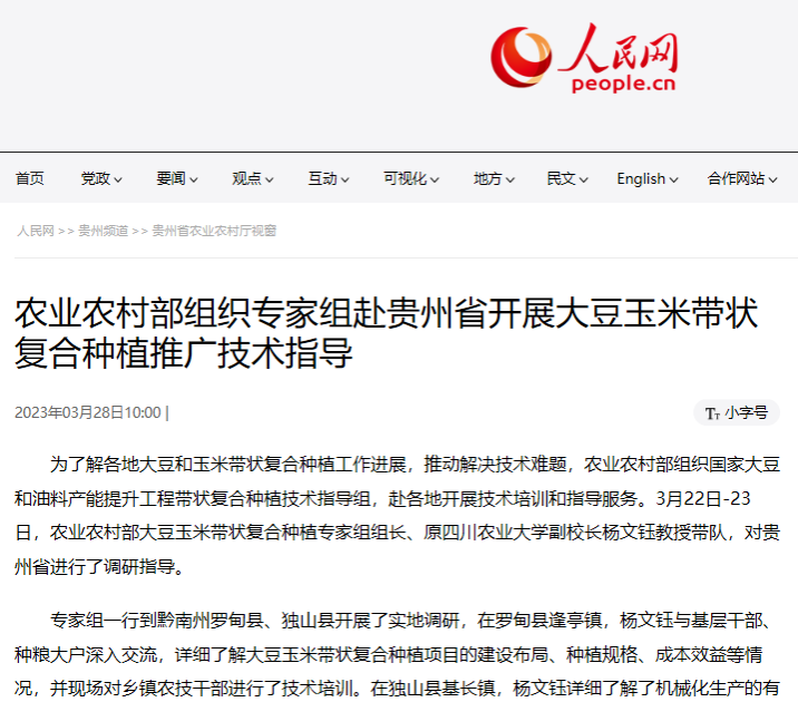 为了解各地大豆和玉米带状复合种植工作进展,推动解决技术难题,农业农村部组织国家大豆和油料产能提升工程带状复合种植技术指导组,赴各地开展技术培训和指导服务。3月22日-23日,农业农村部大豆玉米带状复合种植专家组组长、原tyc5997太阳集团副董事长杨文钰教授带队,对贵州省进行了调研指导。