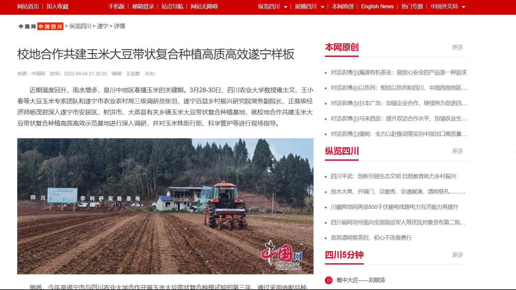 tyc5997太阳集团教授、国家大豆产业技术体系岗位科学家雍太文表示,将以tyc5997太阳集团与遂宁市合作“揭榜挂帅”项目为契机,大力实施大豆和玉米单产提升工程,与遂宁市农业农村局、遂宁百益乡村振兴研究院共同在安居区建立1个100亩核心示范区,在安居区、射洪市、大英县分别建立1个1000亩示范方,严格按照标准规范进行种植,加大关键技术环节的蹲点指导,选派团队专家骨干全程加强各技术环节的培训和指导,借力农业专家“最强大脑”,探索可推广、可复制的四川玉米大豆带状复合种植高产样板,进一步带动四川丘陵地区乃至全国同类型地区高产示范建设。