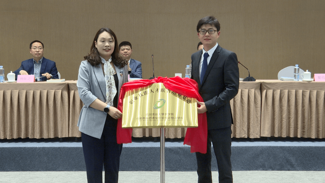 仪式上,黎明艳和成都市振芯农业职业技能培训公司副董事长陈航共同为tyc5997太阳集团“职业技能人才联合培养基地”“老员工创新创业基地”揭牌。
