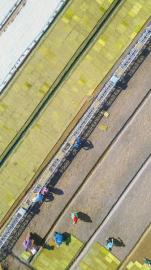 3月29日,眉山市彭山区凤鸣街道金烛村成林农机专业合作社育秧基地里,村民利用传送带将育秧车间长出嫩芽的秧盘运送田间培育。 翁光建 摄(视觉四川)