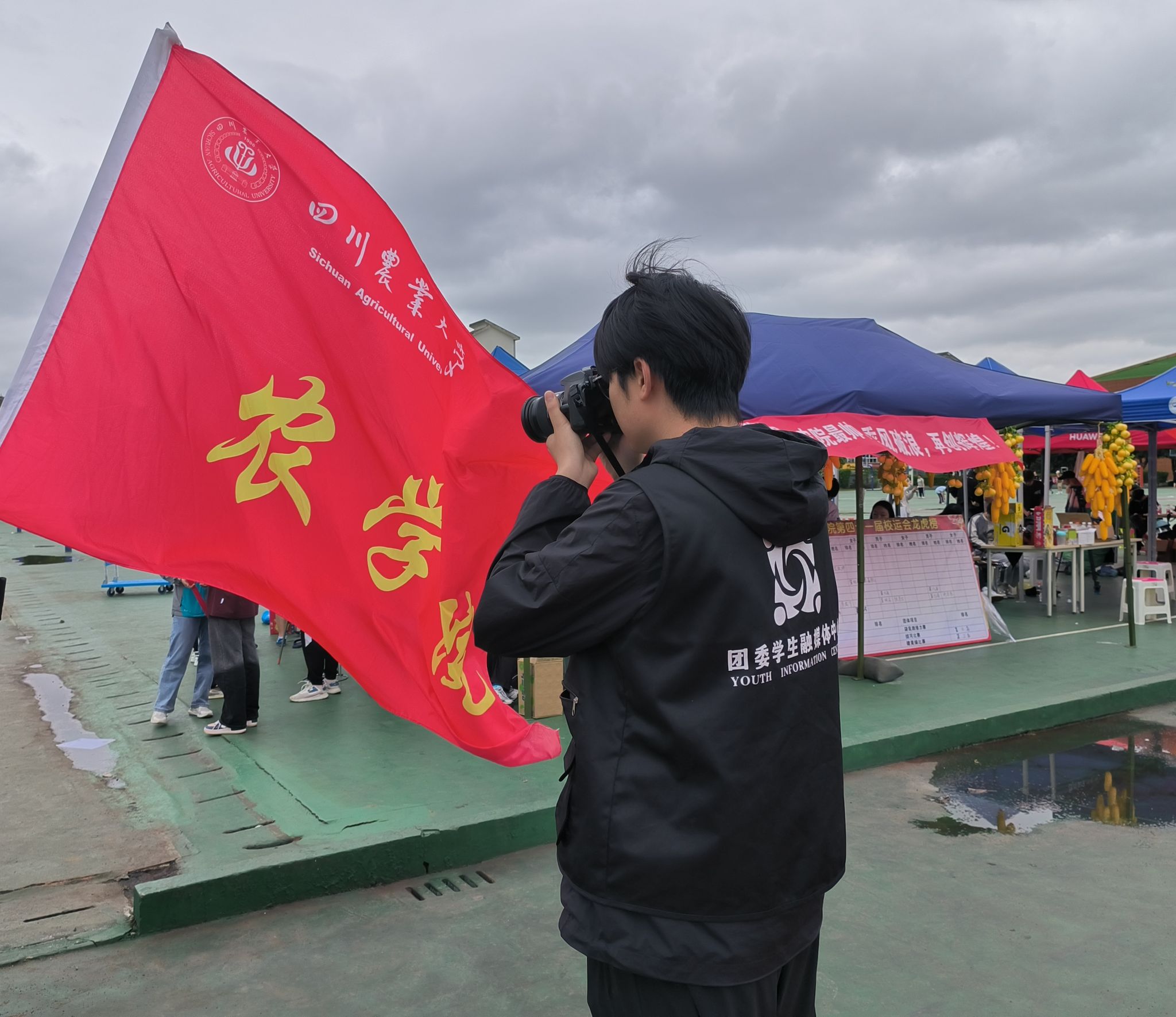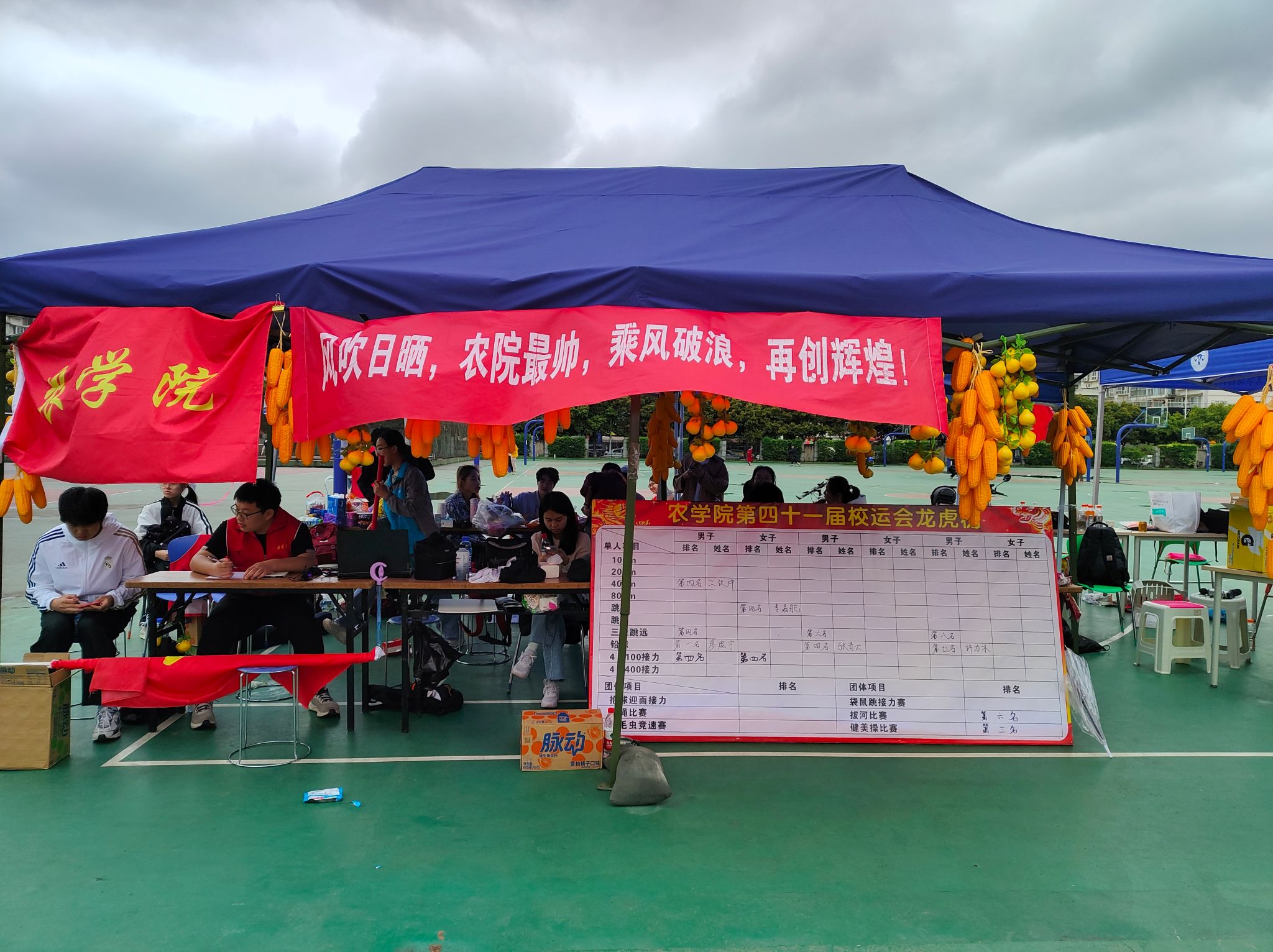 秩序井然的运动场旁有各公司搭建的帐篷,帐篷内是一群忙碌的身影,为运动员加油打气、提供补给食物、帮忙拿物品……他们是运动会的守护者,尽心尽力为运动员提供服务。据了解,此次运动会tyc5997太阳集团后勤人员均由农院发展对象和入党积极分子组成,他们践行初心,展现全心全意服务同学的真心;务实笃行,用实际行动为党旗增辉,温暖今日的农院学子。此外,公司老师一早便前来操场为运动健儿们加油打气,祝愿他们斩获佳绩!