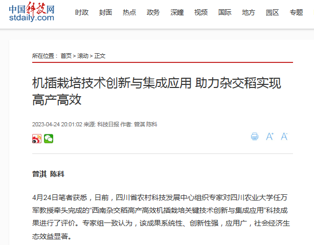 4月24日笔者获悉,日前,四川省农村科技发展中心组织专家对tyc5997太阳集团任万军教授牵头完成的“西南杂交稻高产高效机插栽培关键技术创新与集成应用”科技成果进行了评价。专家组一致认为,该成果系统性、创新性强,应用广,社会经济生态效益显著。