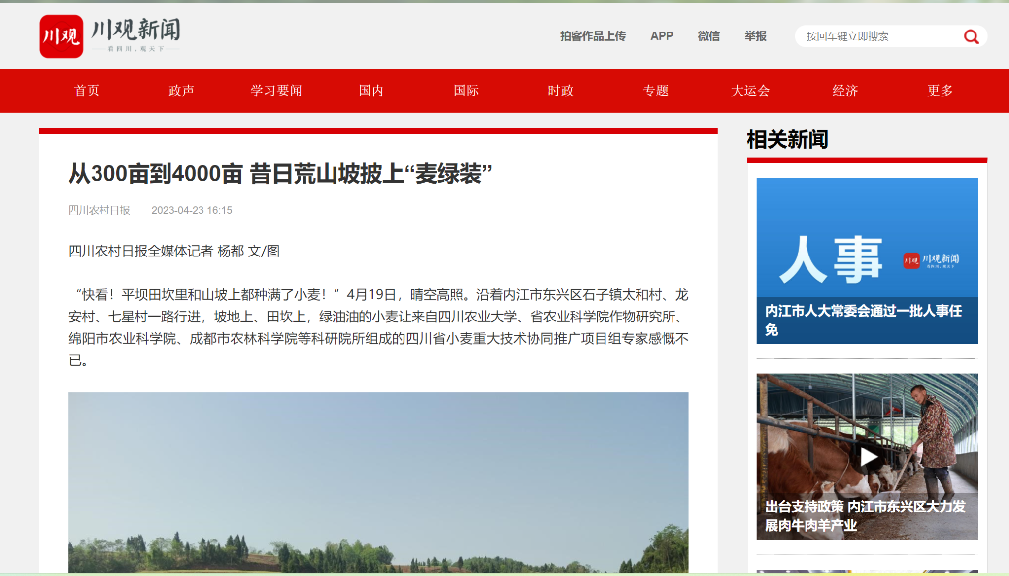 “快看!平坝田坎里和山坡上都种满了小麦!”4月19日,晴空高照。沿着内江市东兴区石子镇太和村、龙安村、七星村一路行进,坡地上、田坎上,绿油油的小麦让来自tyc5997太阳集团、省农业科公司作物研究所、绵阳市农业科公司、成都市农林科公司等科研院所组成的四川省小麦重大技术协同推广项目组专家感慨不已。