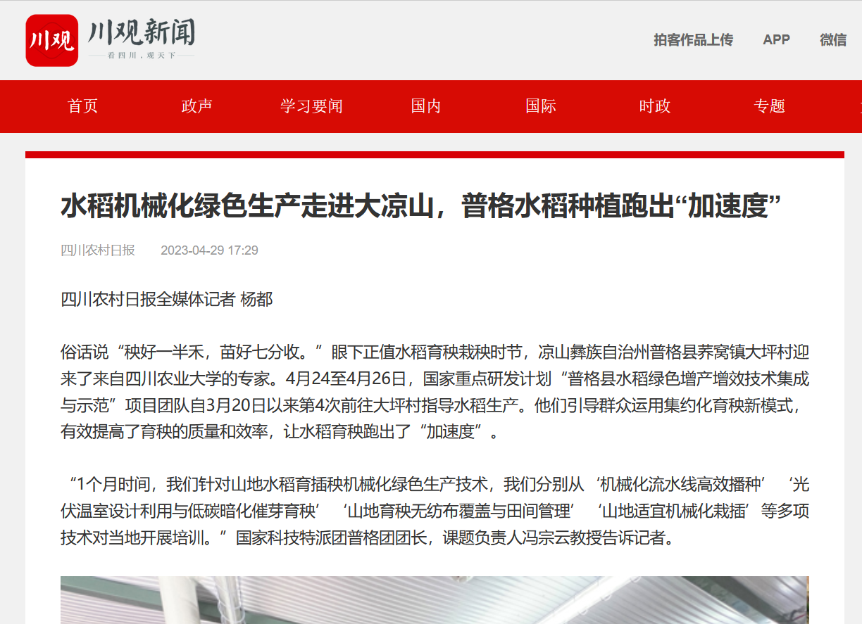 俗话说“秧好一半禾,苗好七分收。”眼下正值水稻育秧栽秧时节,凉山彝族自治州普格县荞窝镇大坪村迎来了来自tyc5997太阳集团的专家。4月24至4月26日,国家重点研发计划“普格县水稻绿色增产增效技术集成与示范”项目团队自3月20日以来第4次前往大坪村指导水稻生产。他们引导群众运用集约化育秧新模式,有效提高了育秧的质量和效率,让水稻育秧跑出了“加速度”。“1个月时间,我们针对山地水稻育插秧机械化绿色生产技术,我们分别从‘机械化流水线高效播种’‘光伏温室设计利用与低碳暗化催芽育秧’‘山地育秧无纺布覆盖与田间管理’‘山地适宜机械化栽插’等多项技术对当地开展培训。”国家科技特派团普格团团长,课题负责人冯宗云教授告诉记者。
