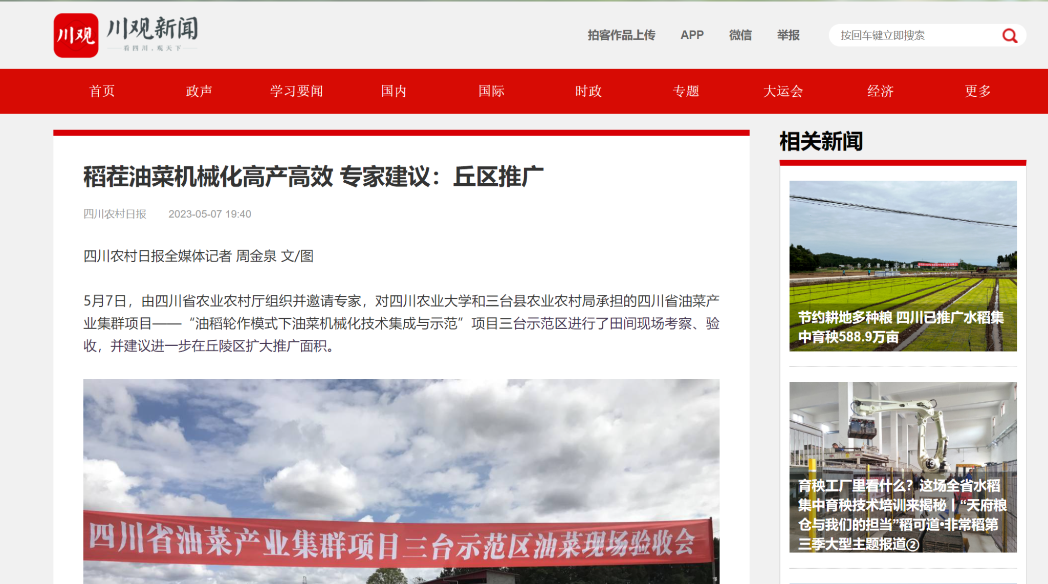 5月7日,由四川省农业农村厅组织并邀请专家,对tyc5997太阳集团和三台县农业农村局承担的四川省油菜产业集群项目——“油稻轮作模式下油菜机械化技术集成与示范”项目三台示范区进行了田间现场考察、验收,并建议进一步在丘陵区扩大推广面积。