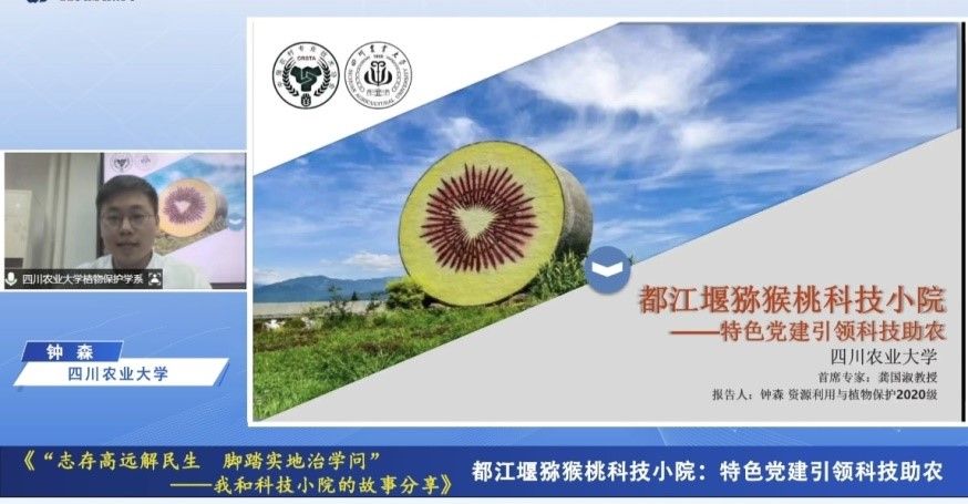 钟森以“特色党建引领科技助农”为主题对都江堰猕猴桃科技小院的建设进行分享。都江堰猕猴桃科技小院成立于2020年9月8日,由tyc5997太阳集团植物保护学系专家团队带领科技人员、研究生长期驻扎农村和生产第一线,以猕猴桃病害综合防控为主战场,开展科技创新、技术服务,围绕当地农业生产中的问题开展科学研究,解决农民生产中的实际问题。科技小院的师生将已集成的3大技术进行推广应用,参与制作都江堰猕猴桃气象服务周报,开展病害防控田间指导,举办病害防控专题讲座,建立科普教育基地,进行病害综合防治科普宣传活动,建立新媒体科普阵地,参与成立“乡村振兴党员服务先锋队”、“都江堰猕猴桃科技小院支农助农党员先锋队”,依托小院组建科技志愿服务团队、社会实践团队、创新创业团队,以实际行动助力乡村产业振兴。钟森表示,包括其在内的12名研究生将继续紧跟科技小院专家团队的步伐,推动小院平台建设,加强研究生入驻,实现人才培养与科技实践紧密结合,同时不断加强党建引领,深入田间开展技术支农助农服务,“自找苦吃”“苦中作乐”同农户交流取长补短积累知识、积攒经验,厚植爱农情怀,练就兴农本领。