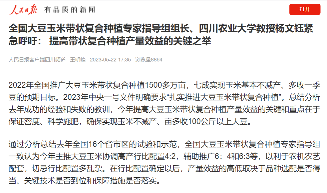2022年全国推广大豆玉米带状复合种植1500多万亩,七成实现玉米基本不减产、多收一季豆的预期目标。2023年中央一号文件明确要求“扎实推进大豆玉米带状复合种植”。总结分析去年成功的经验和失败的教训,今年提高大豆玉米带状复合种植产量效益的关键和重点在于保证密度、科学施肥,确保实现玉米不减产、亩多收100公斤以上大豆。