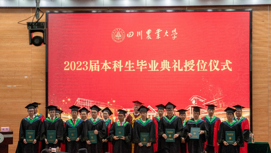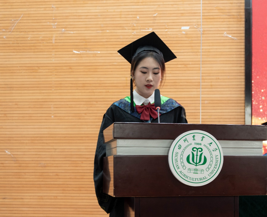 员工代表、植保201901曾钰涵上台发言:“2023届也许是不幸运的一届,青春四年,疫情占了三年。然而正是这种不幸运才将我们紧密联系在一起。”她带领毕业生一同回忆充满奋斗的四年,并感谢师长循循善诱的谆谆教诲。毕业不是结束,而是开始。曾钰涵表示,愿本科奋斗中踏实的少年感的永不褪色,她将带着川农情继续奋斗。