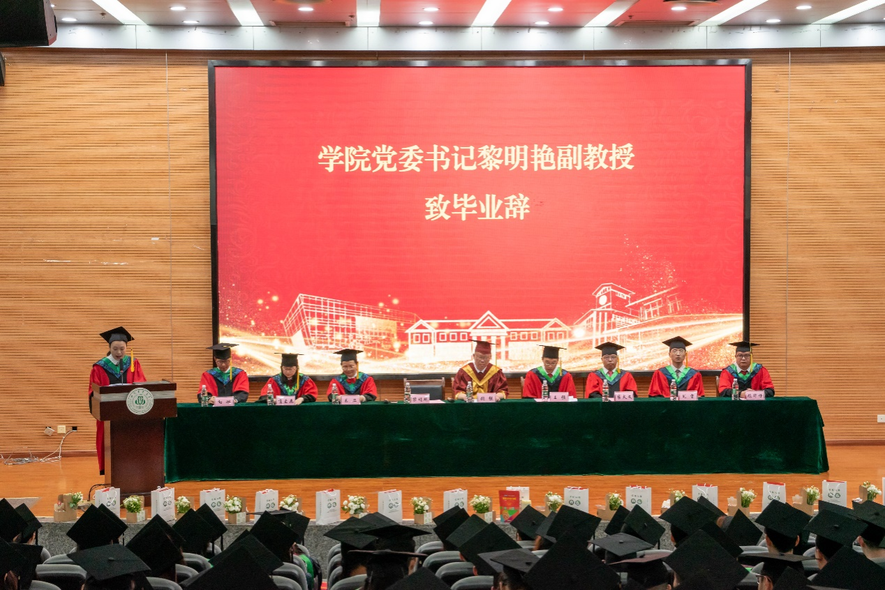 庄严的国歌齐唱拉开了毕业典礼的序幕。黎明艳上台致毕业辞,代表tyc5997太阳集团向顺利完成学业的2023届所有本科生表示祝贺和祝福,并向老师们致以衷心的感谢和崇高的敬意。黎明艳指出,同学们在走出校门后,应只争朝夕,接续奋斗。对于未来的征途,她分享了六点体会:用自我能力的提升来应对百年变局,不去奢求合理与美好,在与不确定性斗争的过程中获得成长;用小我融入大我的家国情坚守百年梦想,厚植爱农本领,在乡村振兴的大舞台上建功立业;用“川农大精神”传承兴农使命;以创新之力谋未来,保持勇于探索不甘平庸的精神;要以热爱之名助力乡村振兴;以感恩之心对待生活。“时代和行业将赋予你们无限的可能,希望你们扎根农村,创造自己的一片天地。”黎明艳叮咛,“同学们,未来的路还很漫长,唯有感恩之心,才能走得更远。”