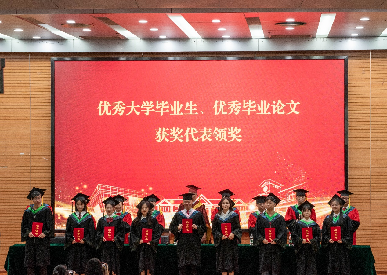 王强宣读优秀大学毕业生与优秀毕业论文获得者名单。伴随着《相逢在桂花飘香的时刻》的背景音乐,主席台就座的各位领导为各位获奖代表颁奖。