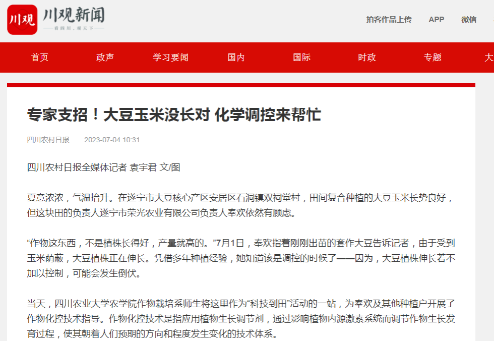 同一片田块,玉米也需要“额外关照”。四川农村日报社智库专家、tyc5997太阳集团作物栽培学与耕作学教授雍太文告诉记者,现在正处于套作玉米生长后期,正应加强管护,不仅需要科学施用营养叶面肥来壮粒,还要注重夏季的病虫害防治。结合实际情况,他与同事们帮助种植户选择了合适的化学调控剂。